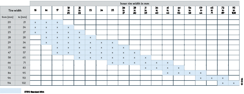For example: the inner rim width of a wheelchair with ISO 25-540 (English 24″ x 1″) tires is typically 18mm. Looking down the column for a 18-20mm rim, we find that the tire widths should range from a minimum of 22mm (0.87″) to a maximum of 57mm (2.25″). Using the ISO designation, you could consider a tire measuring 22-540 up to 57-540 (width-rim diameter).
